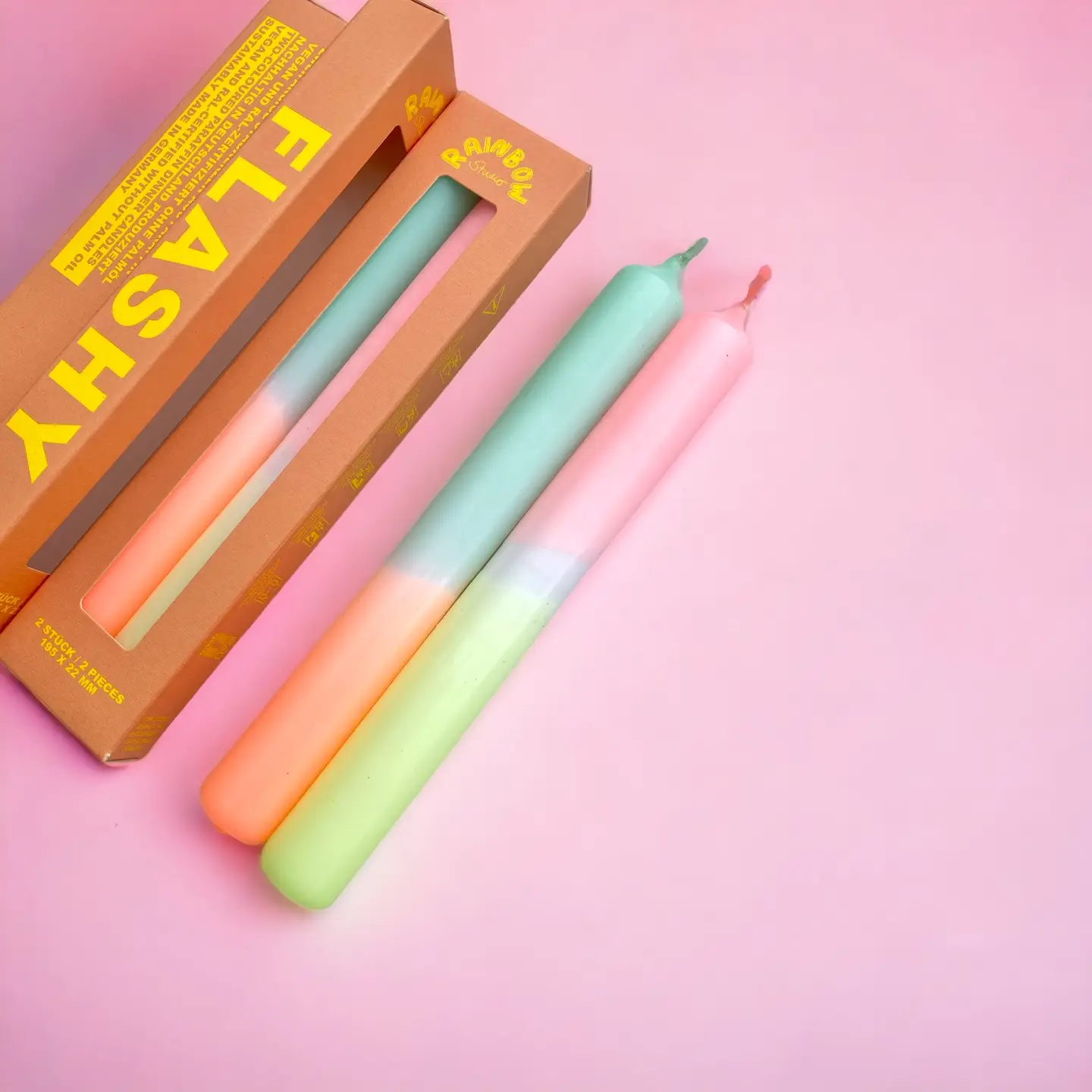 Liebevoll getauchte Neonkerzen aus sorgfältig ausgewähltem Paraffin. Handgefertigt in den malerischen Ausläufern der bayerischen Alpen.