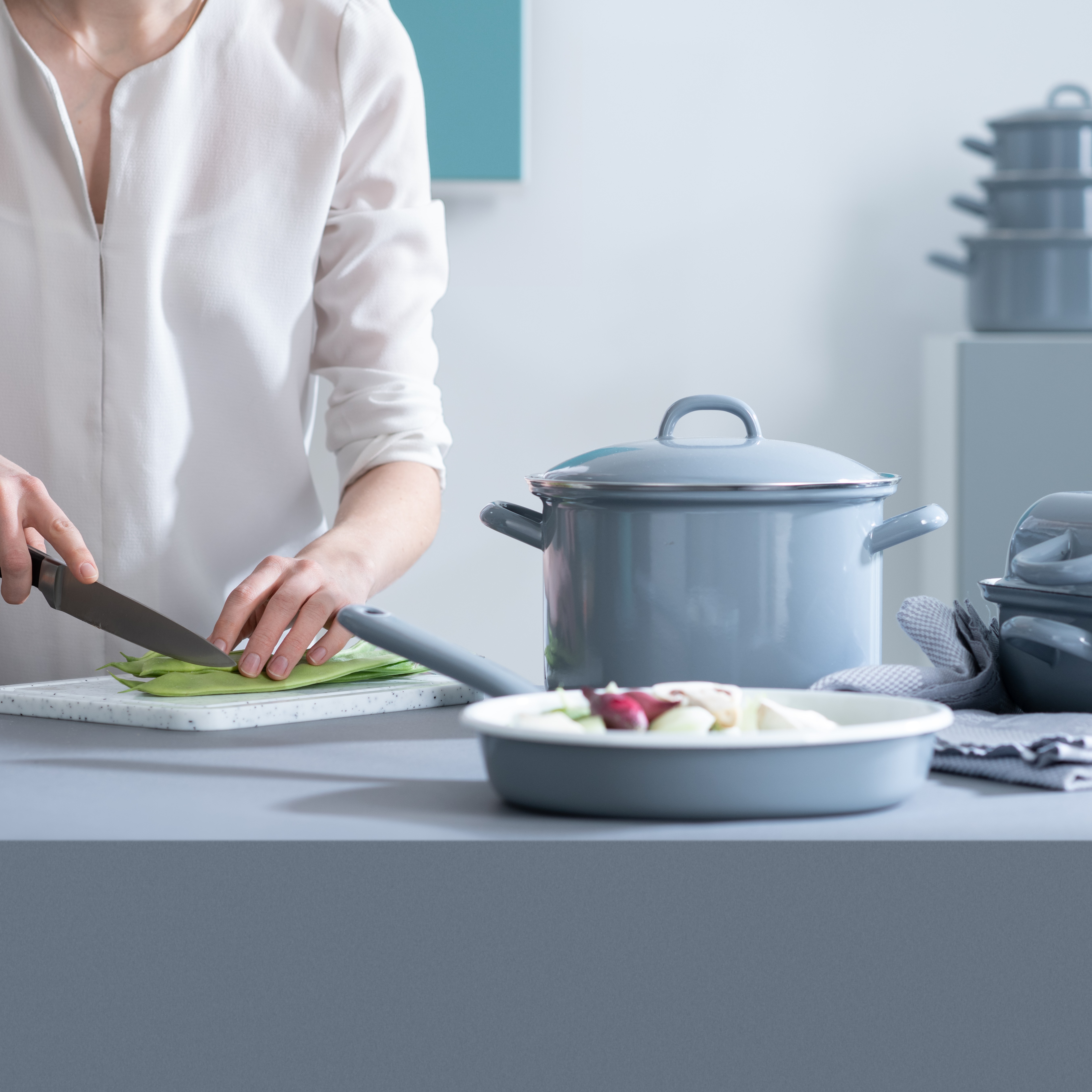 Emaille ist das Beste für gesundes Braten. Aus natürlichen Rohstoffen hergestellt, verbindet es die positiven Eigenschaften von Glas und Stahl. Die porenfreie, glatte Oberfläche ist bakterien- und schmutzabweisend und verhindert bei richtigem Gebrauch ein Anbrennen der Speisen. Die graue Riess Omelettpfanne erreicht auch bei geringer Wärmezufuhr hohe Temperaturen und eignet sich so auch perfekt zum scharf Anbraten und Bräunen.