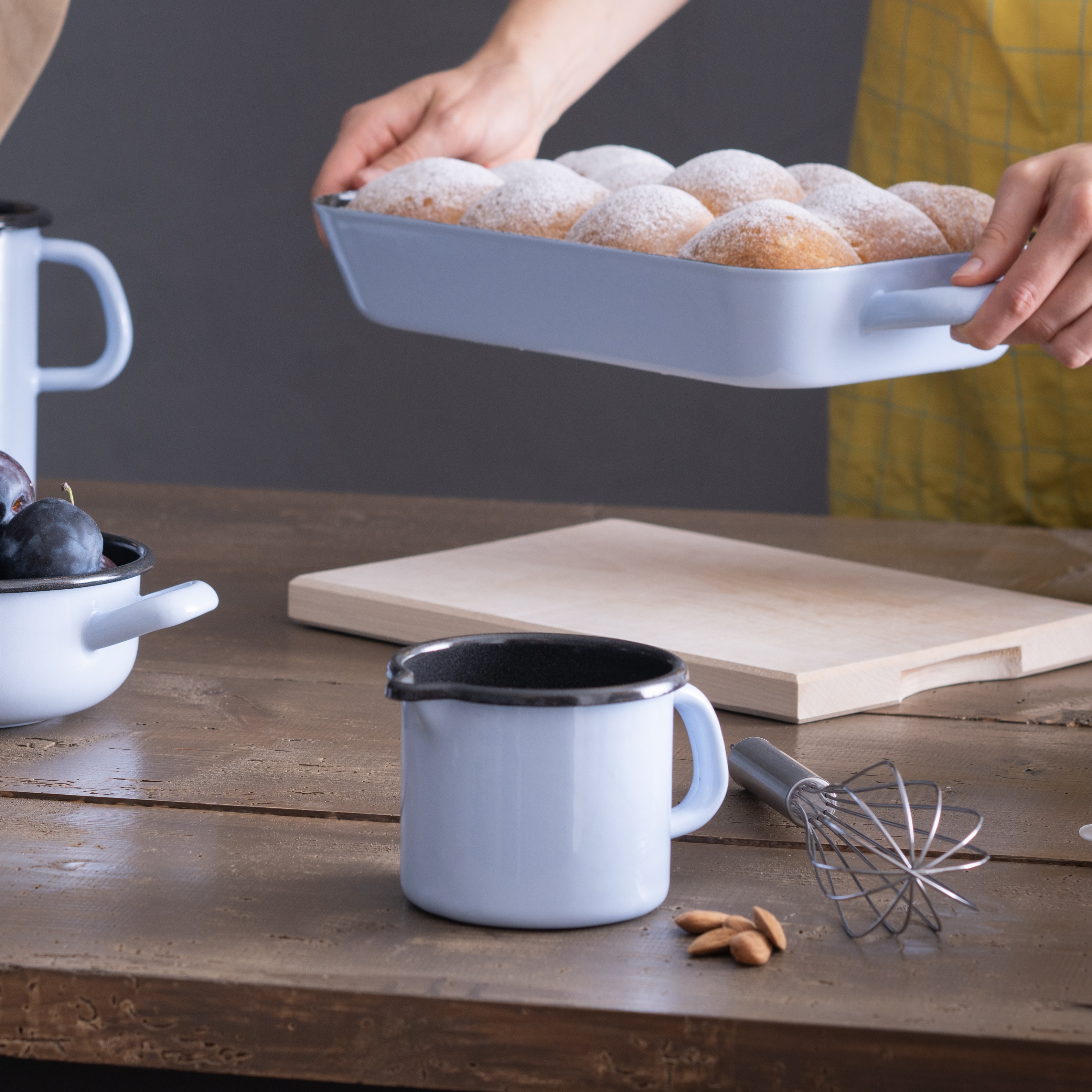 Emaille eignet sich bestens für gesundes Backen. Es wird aus natürlichen Rohstoffen hergestellt und alle Lebensmittel behalten in diesem Riess Emaille Schnabeltopf ihren natürlichen, reinen Geschmack. Die gleichmässige Wärmeleitung ermöglicht beste Backergebnisse. Das blaue Backemaille hat eine spezielle Innenemaillierung, welche hervorragende Entformungseigenschaften hat.